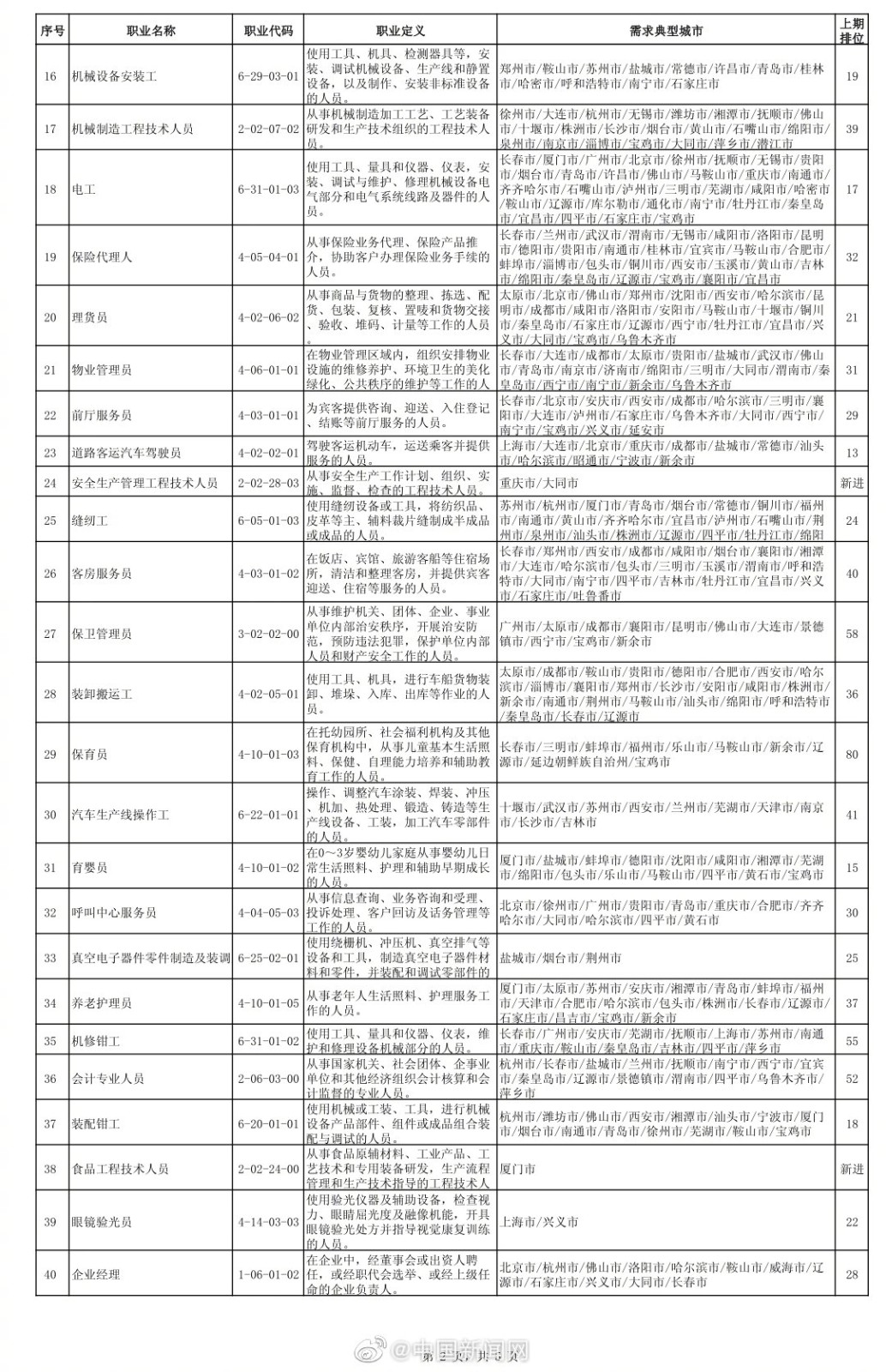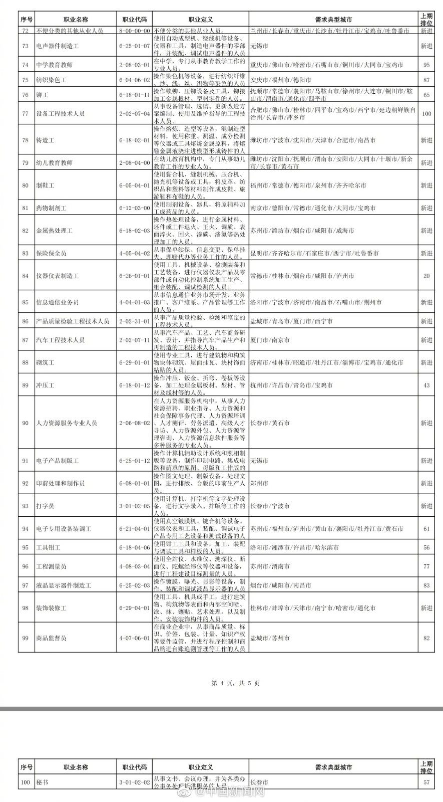 1月26日,人社部发布2020年第四季度全国招聘大于求职“最缺工”的100个职业排行。